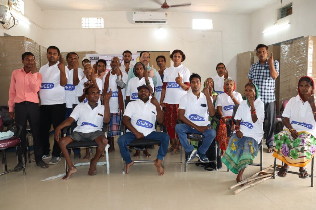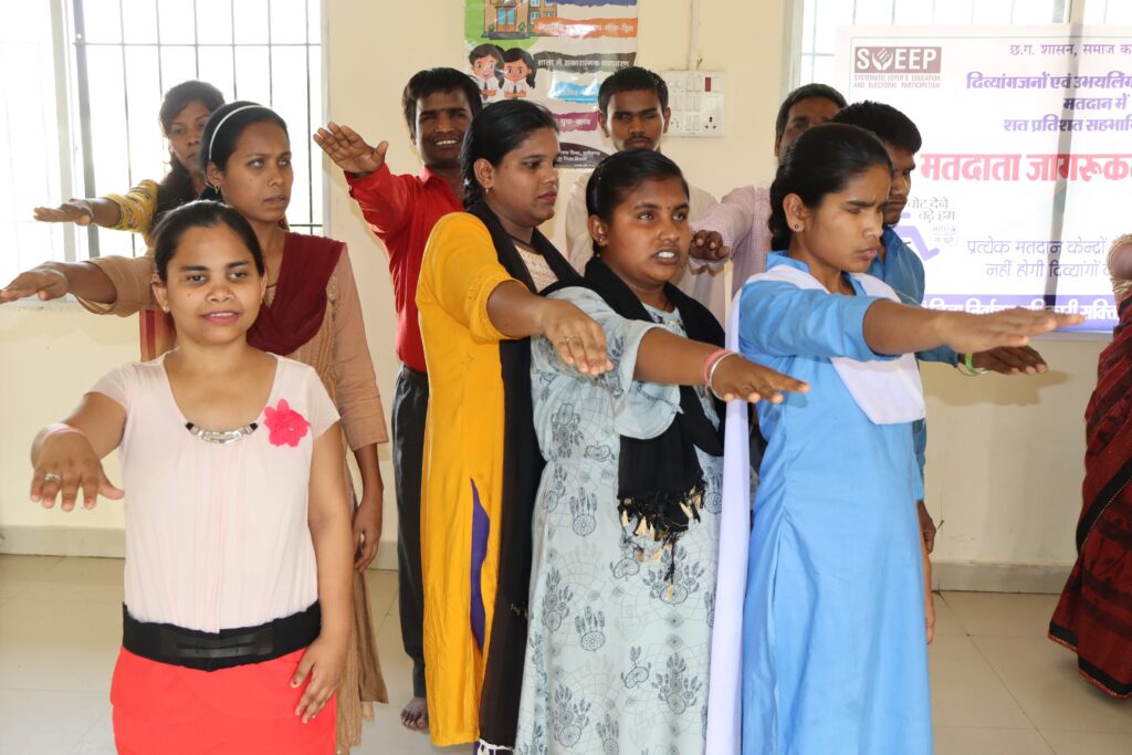 सक्ती :– कलेक्टर एवं जिला निर्वाचन अधिकारी अमृत विकास तोपनो के निर्देशानुसार आज समाज कल्याण विभाग सक्ती द्वारा जिला स्तरीय स्वीप कार्यक्रम के अंर्तगत जिले के उभयलिंग, दिव्यांग जन तथा वरिष्ठ नागरिकों को मतदान हेतु शपथ कार्यक्रम का आयोजन समाज कल्याण कार्यालय जेठा में किया गया। जिसमें तृतीय लिंग सम्मेलन में अपने संवर्ग का शत प्रतिशत निष्पक्ष मतदान हेतु जागरूक करने की शपथ ली गई। श्रव्य बाधित दिव्यांगजनों द्वारा आदर्श मतदान हेतु चित्रों के माध्यम से जागरूकता का संदेश प्रस्तुत किया गया तथा दृष्टिबाधित दिव्यांगजनों द्वारा शतप्रतिशत मतदान करने तथा अपने मताधिकार के निष्पक्ष प्रयोग हेतु प्रेणात्मक उदबोधन दिया गया। कार्यक्रम में जिलाधिकारी समाज कल्याण विभाग सुनील मिश्रा, परिवेक्षक अधिकारी सुरेश कुमार भारती सहित समस्त संबंधित अधिकारी कर्मचारी, समस्त उभयलिंग एवं वरिष्ठजन / दिव्यांगजन उपस्थित रहे।