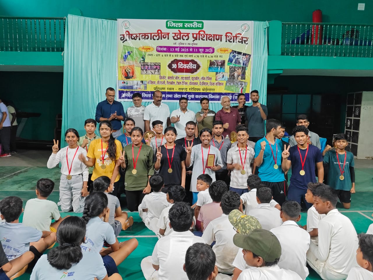 रायगढ़ :- 11 जून 2025/ रायगढ़ स्टेडियम बोईरदादर में 30 दिवसीय जिला स्तरीय ग्रीष्मकालीन खेल प्रशिक्षण शिविर का समापन हुआ। 13 मई से 11 जून 2025 तक आयोजित ग्रीष्मकालीन खेल शिविर में कुल 11 विभिन्न खेल विधाओं में लगभग 276 छात्र-छात्राओं की सक्रिय भागीदारी रही। शिविर का उद्देश्य विद्यार्थियों को खेलों की तकनीकी जानकारी प्रदान करना, उनकी प्रतिभा को निखारना तथा खेलों के प्रति जागरूकता बढ़ाना रहा।