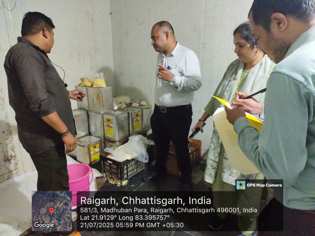 रायगढ़ :- 22 जुलाई 2025/ स्वास्थ्य एवं परिवार कल्याण विभाग और खाद्य एवं औषधि प्रशासन के निर्देशानुसार तथा कलेक्टर मयंक चतुर्वेदी के मार्गदर्शन में जिले में आगामी त्यौहारों के मद्देनजर जिले के विभिन्न प्रतिष्ठानों का निरीक्षण कर दूध एवं दूध से बने खाद्य पदार्थों की गुणवत्ता की जांच की जा रही है और खाद्य पदार्थों में मिलावट करने वालों के विरूद्ध नियमानुसार कार्रवाई की जा रही है। इसी क्रम में खाद्य सुरक्षा विभाग की टीम ने रायगढ़ शहर के विभिन्न खाद्य प्रतिष्ठानों का आकस्मिक निरीक्षण किया और दूध व दुग्ध उत्पादों सहित अन्य खाद्य सामग्रियों की गुणवत्ता की जांच की। अभियान के दौरान टीम ने शहर के कई प्रतिष्ठानों से नमूने एकत्र किए।