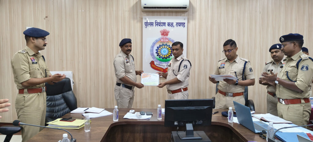 समीक्षा बैठक के दौरान उत्कृष्ट कार्य करने वाले पुलिसकर्मियों को प्रशस्ति पत्र देकर सम्मानित किया गया। थाना कोतवाली के आरक्षक लोमेश सिंह राजपूत और प्रदीप मिंज को ओडिशा (झारसुगुड़ा) से मारपीट के आरोपी की गिरफ्तारी, जूटमिल थाना के प्रधान आरक्षक वीरेंद्र भगत, आरक्षक परमानंद पटेल और महिला आरक्षक आशा सिदार को 17 वर्षीय बालिका को जबलपुर (मध्यप्रदेश) से दस्तयाब करने, प्रधान आरक्षक मोहम्मद दिलदार कुरेशी और आरक्षक लखेश्वर पुरसेठ को हीरो होंडा शोरूम से नगदी की शत-प्रतिशत बरामदगी, तमनार थाना के प्रधान आरक्षक बनारसी लाल सिदार और हेमंत पात्रे को उड़ीसा से गुम महिला की दस्तयाबी, घरघोड़ा थाना क्षेत्र में हत्या के मामले में 3 घंटे में आरोपी की गिरफ्तारी में सराहनीय भूमिका निभाने वाले प्रधान आरक्षक पारसमणी बेहरा और आरक्षक हरीश पटेल, तथा कापू थाना क्षेत्र की गुम बालिका को झारखंड से बरामद कर लाने में उल्लेखनीय योगदान देने वाले प्रधान आरक्षक मनोज सिंह, आरक्षक संजीव पटेल एवं विक्रांत भगत को प्रशस्ति पत्र प्रदान कर उनका उत्साहवर्धन किया गया। बैठक में एडिशनल एसपी आकाश मरकाम, नवपदस्थ सीएसपी मयंक मिश्रा, एसडीओपी खरसिया/सायबर सेल अनिल विश्वकर्मा, एसडीओपी धरमजयगढ़ सिद्धांत तिवारी, ट्रैफिक डीएसपी उत्तम प्रताप सिंह तथा सभी थाना, चौकी प्रभारी उपस्थित रहे ।