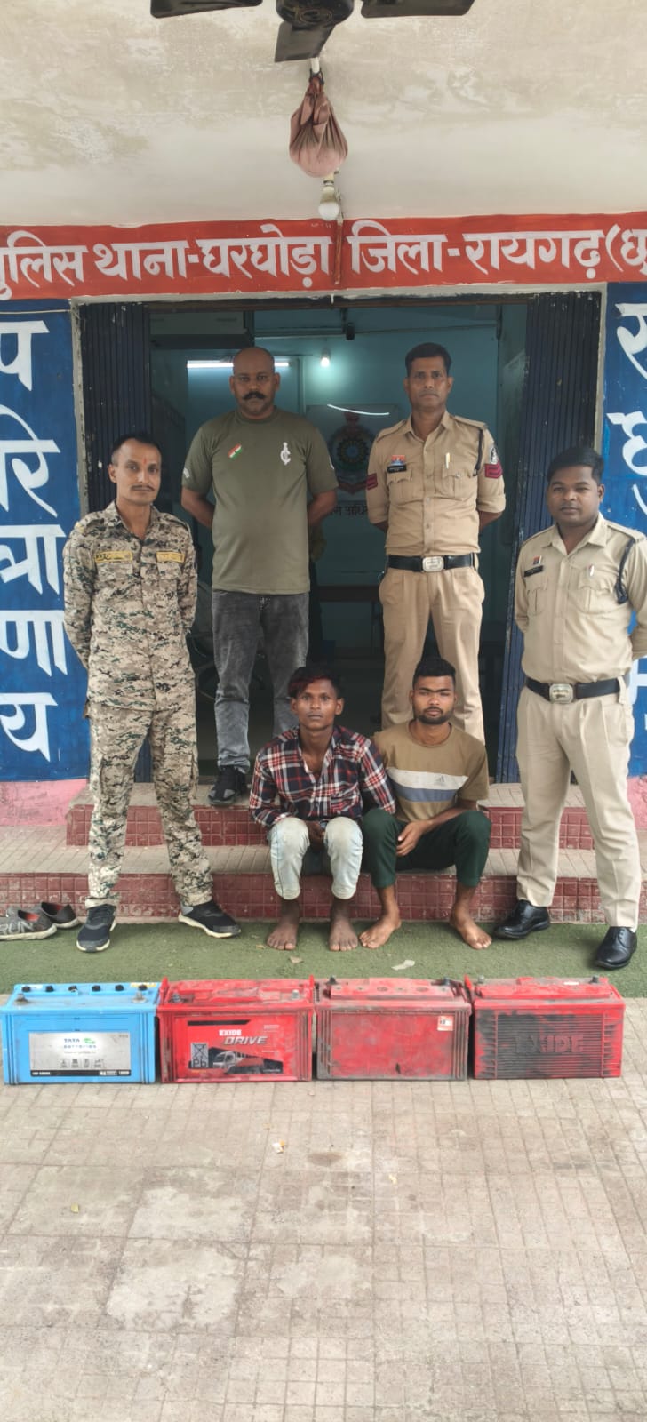 दोनों मामलों की जानकारी पुलिस कप्तान दिव्यांग पटेल के संज्ञान में आने पर उनके निर्देश पर थाना प्रभारी निरीक्षक कुमार गौरव साहू ने टीम बनाकर मुखबिर तंत्र की मदद से बायपास रोड घरघोड़ा में दोनों आरोपियों को पकड़ा। पूछताछ में प्रारंभ में आरोपियों ने घटना से इंकार किया, लेकिन सख्ती से पूछताछ करने पर उन्होंने पत्थलगांव से बस द्वारा घरघोड़ा आकर ढाबा और सड़क किनारे खड़े वाहनों की रेकी कर बैटरी चोरी करने की बात स्वीकार की। चोरी की गई सभी चार बैटरियां पावरग्रिड चुहकीमार के पास नर्सरी के गड्ढों में छिपाकर रखी गई थीं, जिन्हें पुलिस ने बरामद कर लिया।