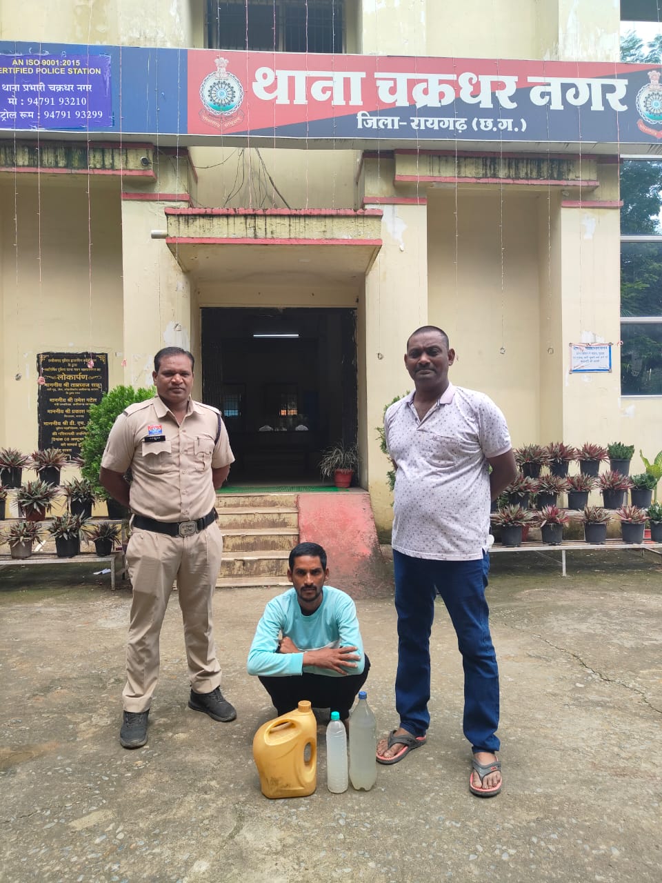 रायगढ़ :- 13 अगस्त 2025 – पुलिस अधीक्षक दिव्यांग पटेल के निर्देशन और अतिरिक्त पुलिस अधीक्षक आकाश मरकाम व नगर पुलिस अधीक्षक मयंक मिश्रा के मार्गदर्शन में चक्रधरनगर पुलिस ने अवैध शराब कारोबार पर कार्रवाई जारी है। थाना प्रभारी निरीक्षक अमित शुक्ला के नेतृत्व में 12 अगस्त को ग्राम कोलईबहाल जामगांव में दो अलग-अलग स्थानों पर दबिश दी गई, जहां से कुल 20 लीटर महुआ शराब बरामद कर दो आरोपियों को गिरफ्तार किया गया। पुलिस को मुखबिर से सूचना मिली थी कि ग्राम कोलईबहाल जामगांव निवासी राजेश कुमार सूर्यवंशी (32) और प्रेम कुमार किसान (39) अपने पास बिक्री हेतु अवैध महुआ शराब संग्रहित किए हुए हैं। सूचना पर तत्काल कार्रवाई करते हुए पुलिस टीम मौके पर पहुंची और दबिश के दौरान राजेश के कब्जे से 8 लीटर शराब, कीमत 1,600 रुपये तथा प्रेम कुमार के पास से 12 लीटर शराब, कीमत 2,400 रुपये बरामद की गई। दोनों के विरुद्ध आबकारी एक्ट की धारा 34(2), 59(क) के तहत अपराध क्रमांक 358/2025 एवं 359/2025 दर्ज कर रिमांड पर भेजा गया।