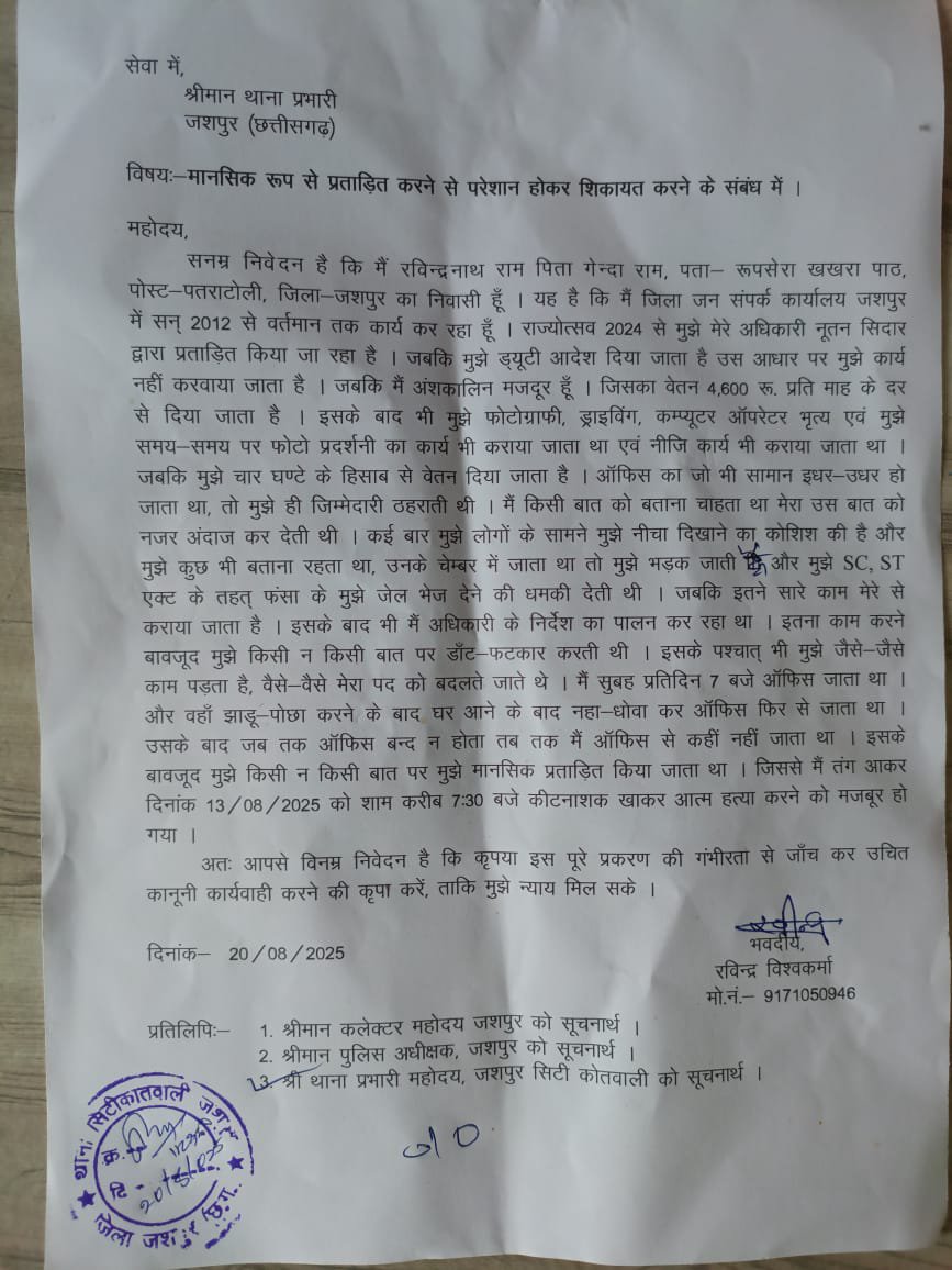 जशपुर :- जिले से एक गंभीर मामला सामने आया है। जिला जनसम्पर्क कार्यालय जशपुर में पदस्थ एक अंशकालिक कर्मचारी ने अपने अधिकारी पर लगातार मानसिक प्रताड़ना का आरोप लगाते हुए आत्महत्या का प्रयास किया। पीड़ित ने इस संबंध में थाना सिटी कोतवाली जशपुर और पुलिस अधीक्षक कार्यालय को लिखित शिकायत सौंपकर दोषी अधिकारी के खिलाफ कठोर कार्रवाई की मांग की है।