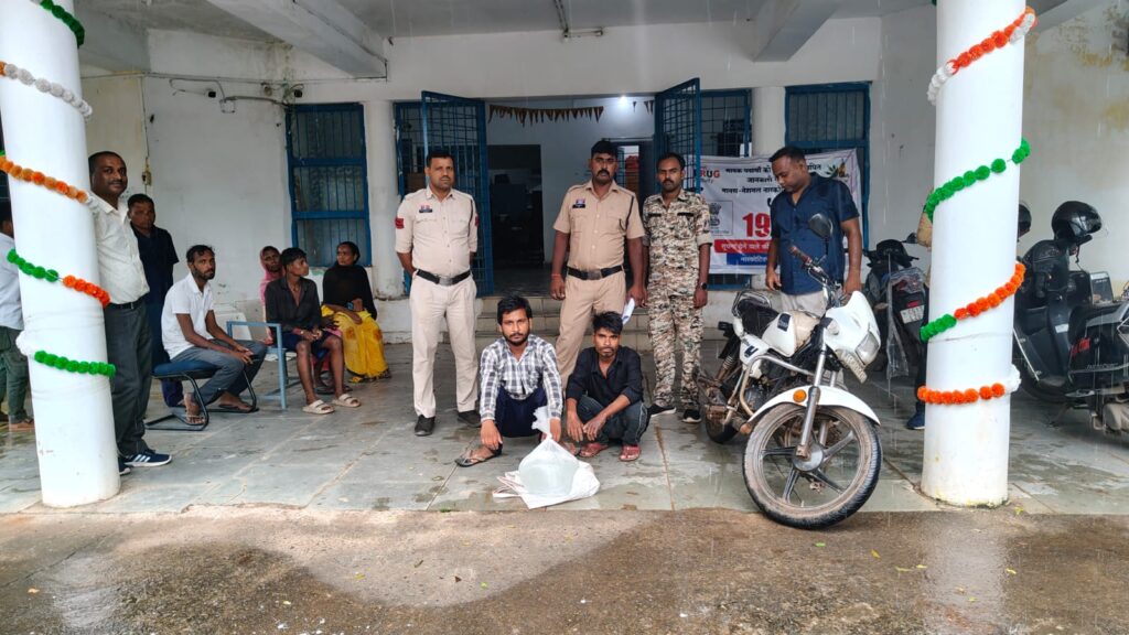 सूचना पर पुलिस ने पुसौर से गोतमा रोड पर ईटा भट्टा के पास घेराबंदी कर सफेद मोटरसाइकिल क्रमांक CG 13 AT 7424 को रोककर उसमें सवार दोनों संदेहियों को पकड़ा। पूछताछ में चालक ने अपना नाम जगन्नाथ जांगड़े पिता मंगलु जांगड़े उम्र 25 वर्ष निवासी टपरदा तथा पीछे बैठे व्यक्ति ने अपना नाम जगदीश सारथी पिता मोहितलाल सारथी उम्र 30 वर्ष निवासी टपरदा थाना पुसौर बताया। तलाशी लेने पर दोनों के बीच रखे सफेद थैले में प्लास्टिक की पन्नी में भरा लगभग 10 लीटर कच्ची महुआ शराब, जिसकी कीमत करीब 2000 रुपए है, बरामद हुई।