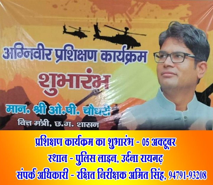 रायगढ़ :-26 सितंबर । शासन की अहम अग्निवीर योजना में लिखित परीक्षा में चयनित अभ्यर्थियों के फिजिकल टेस्ट के पूर्व उन्हें पुलिस विभाग के ट्रेनर्स के द्वारा ट्रेनिंग दी जाएगी। इस संबंध में वित्त मंत्री ओपी चौधरी सर द्वारा अधिकारियों को निर्देश दिए गए हैं। जिला प्रशासन और पुलिस द्वारा “अग्निवीर” योजना में चयनित होने की तैयारी कर रहे युवाओं के लिए इस वर्ष भी पुलिस लाइन उर्दना में नि:शुल्क विशेष प्रशिक्षण शिविर आयोजित किया जावेगा ।