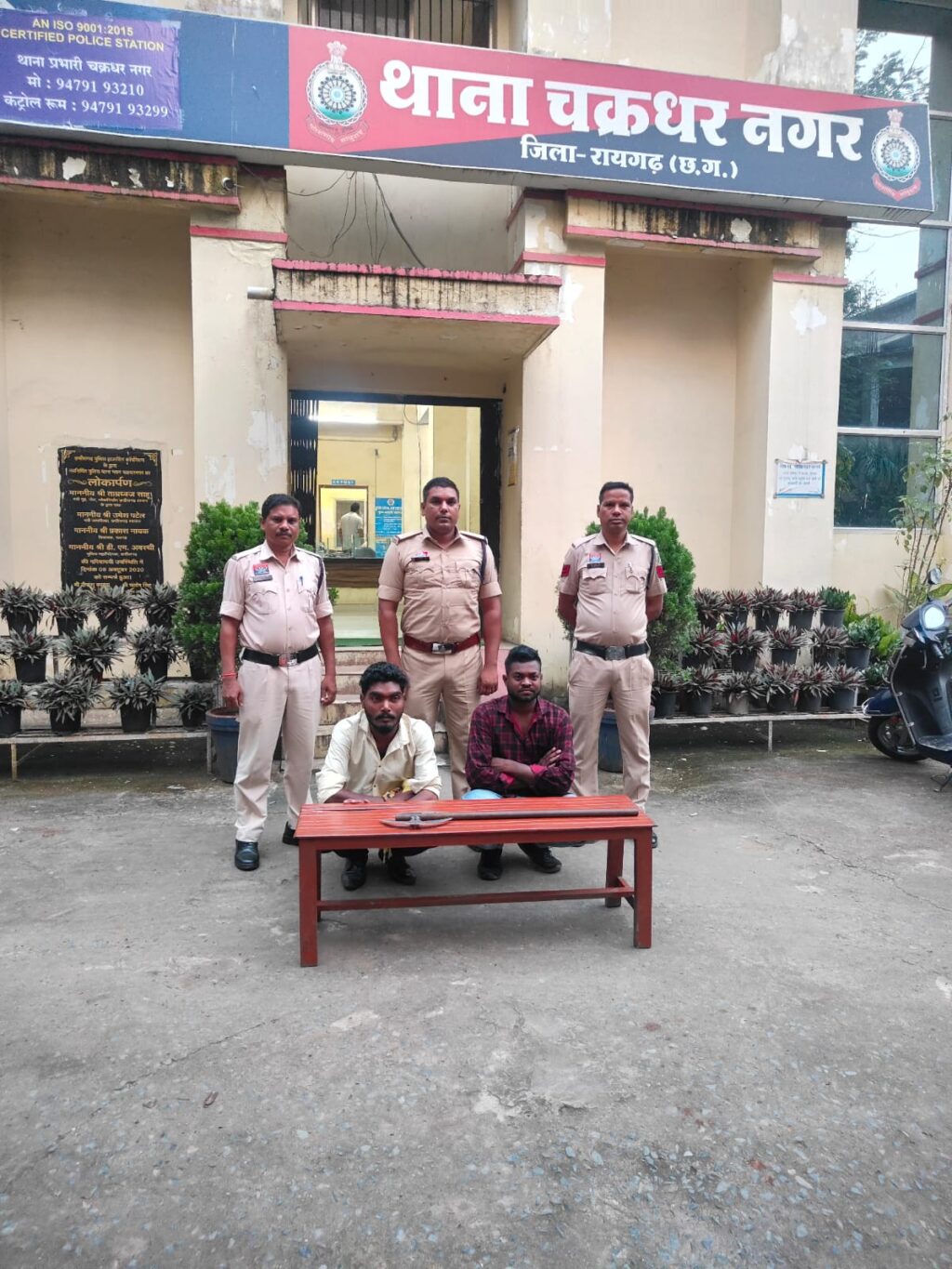 रायगढ़ :- 8 अक्टूबर । चक्रधरनगर पुलिस ने 7 अक्टूबर मंगलवार शाम मानकेश्वरी मंदिर के मेला स्थल (जामगांव) में धारदार हथियार लेकर घूम रहे दो युवकों को पकड़कर जेल भेज दिया है। दोनों आरोपी फरसा लहराते हुए लोगों को भयभीत कर रहे थे, जिन पर पुलिस ने आर्म्स एक्ट की सख्त धाराओं में मामला दर्ज किया है।