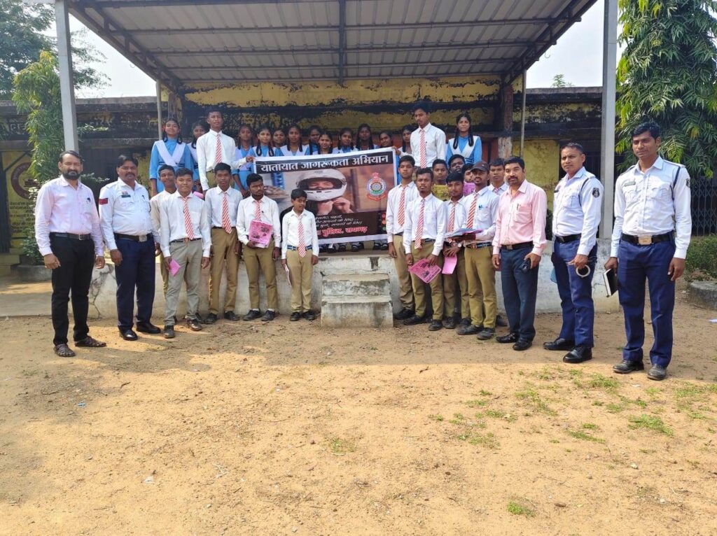 रायगढ़ :- 14 अक्टूबर । पुलिस अधीक्षक दिव्यांग पटेल के दिशा निर्देशन एवं डीएसपी ट्रैफिक उत्तम प्रताप सिंह के मार्गदर्शन पर आज यातायात पुलिस रायगढ़ द्वारा शासकीय उच्चतर माध्यमिक विद्यालय कांटाहरदी में यातायात जागरूकता कार्यक्रम आयोजित किया गया। कार्यक्रम में प्रधान आरक्षक मुकेश चौहान द्वारा छात्र-छात्राओं एवं अध्यापकों को सुरक्षित यातायात नियमों की जानकारी विस्तारपूर्वक दी गई। उन्होंने कहा कि प्रत्येक नागरिक को सड़क पर चलते समय न केवल अपनी बल्कि दूसरों की सुरक्षा का भी ध्यान रखना चाहिए।