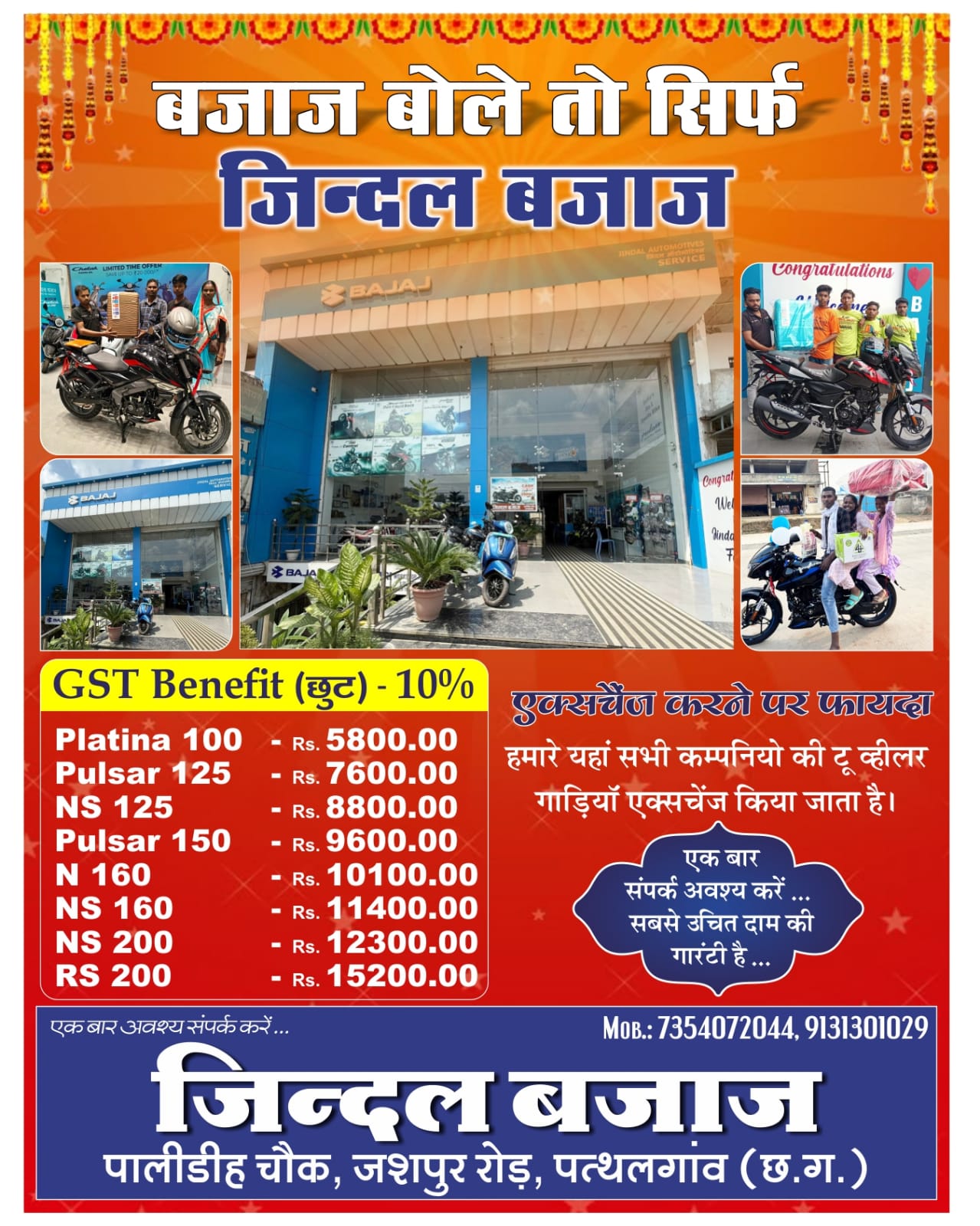 पता जिंदल बजाज पत्थलगांव जशपुर रोड पालीडीही चौक पत्थलगांव।
