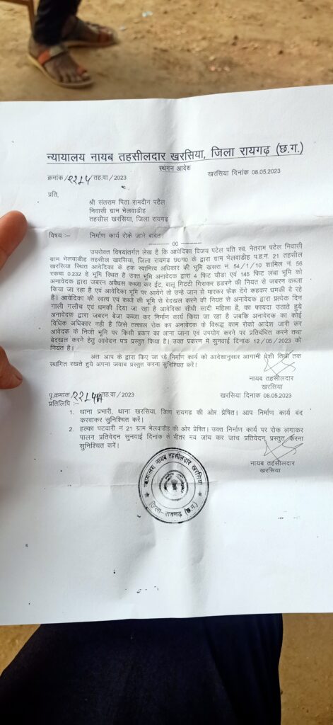 खरसिया। ग्राम भेलवाडीह मे दबंगों के द्वारा जबरन निजी भूमि पर कब्जा किया जा रहा है आवेदिका विजय पटेल स्वर्गीय नेतराम पटेल जो की ग्राम भेलवाडीह की मूल निवासी है जिनकी निजी भूमि जिसका खसरा नंबर 54/1/10 शामिल नंबर 56 रकबा 0.232 हे.भूमि स्थित है उक्त भूमि पर अनावेदक द्वारा 4फिट चौड़ा तथा 145 फिट लंबा भूमि को अवैध तरीके से कब्जा कर ईट रेतीं व गिट्टी गिराया जा रहा है तथा मना करने पर आवेदिका को बे मतलब धमकाया जा रहा है तथा गंदी गंदी गली गलौज किया जा रहा है जिसकी शिकायत माननीय न्यायालय नायब तहसीलदार खरसिया जिला रायगढ़ छत्तीसगढ़ मे किया है